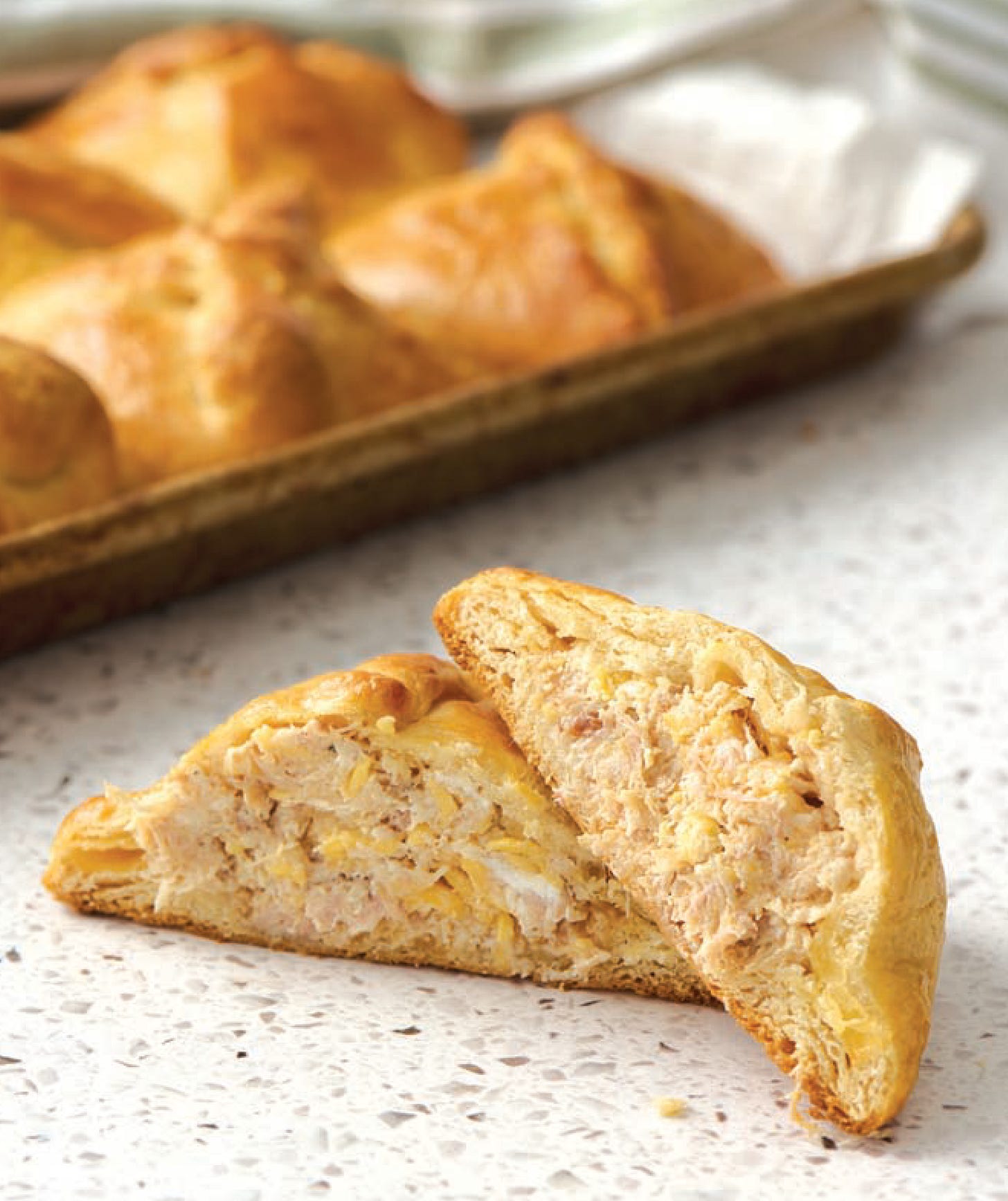 Unroll crescent roll dough and connect 2 dough triangles together to make 1 square. Repeat to make 4 squares.