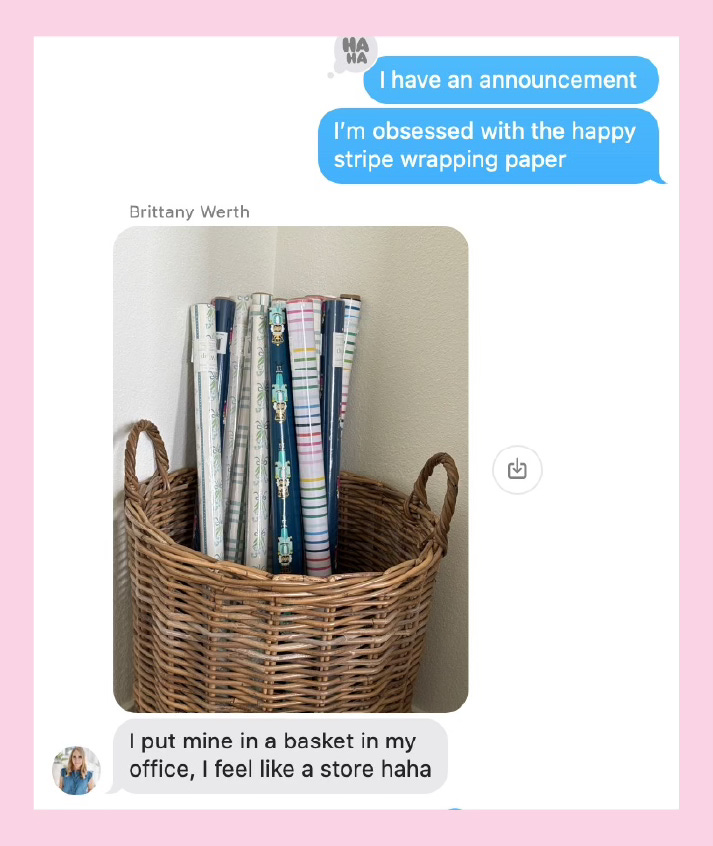 Lindsey wrapped a baby gift in Happy Stripe wrapping paper this week and has now decided she’s obsessed. She said she’s planning her holiday decor around it. Try organizing your wrapping paper in a basket this year so it’s not all over the place!