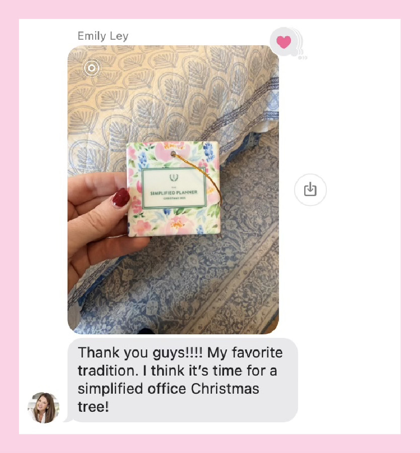 Every year, our team gifts Emily a Christmas ornament with a Simplified Planner cover from that year. It’s such a special tradition, and now she has enough to fill a whole tree. So many amazing years!