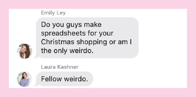 Laura: Make a plan. Use your Notes app to organize gifting by person that you can put ideas into during the year. In October/November I’ll simplify this list and keep my eyes on deals and STICK to the list. I like to picture my ideal Christmas morning with my girls and that helps me stay focused and not overbuy or impulse shop in December. A slow morning of peace and joy is what I’m after, and that helps me keep things simple. ❤️