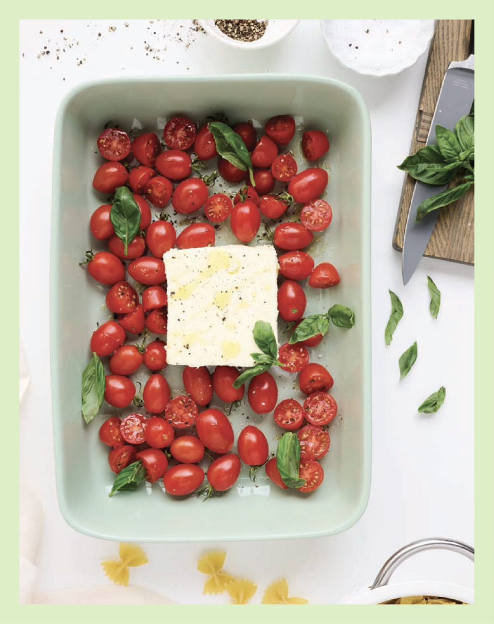 Place feta cheese in center of baking dish, and place the tomatoes around the feta.