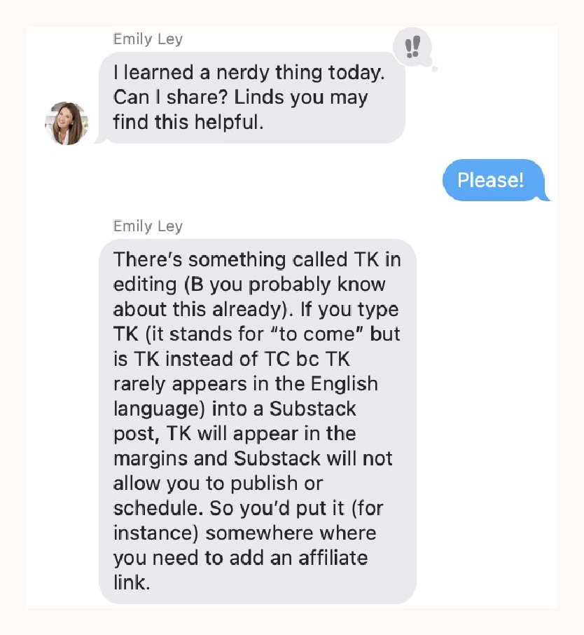 One thing about our team is we love share what we learn. No gatekeeping here! Sometimes we will work on a draft post or project and come back to it later. This use of “T K” is really helpful so we don’t post anything before it’s truly finished.