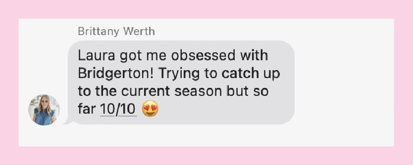Team meetings are now filled with lots of Bridgerton talk. Laura convinced Brittany to start watching and now Brittany can’t look away, listening to podcasts, and watching Queen Charlotte too!
